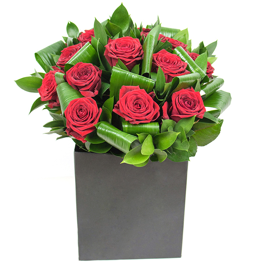 Adorn any space with the graceful elegance of our hand-picked red roses, beautifully paired with aspidistra leaves and ruscus. This unique arrangement exudes style and refinement, making it an excellent gift choice or a stunning addition to your home ambiance.